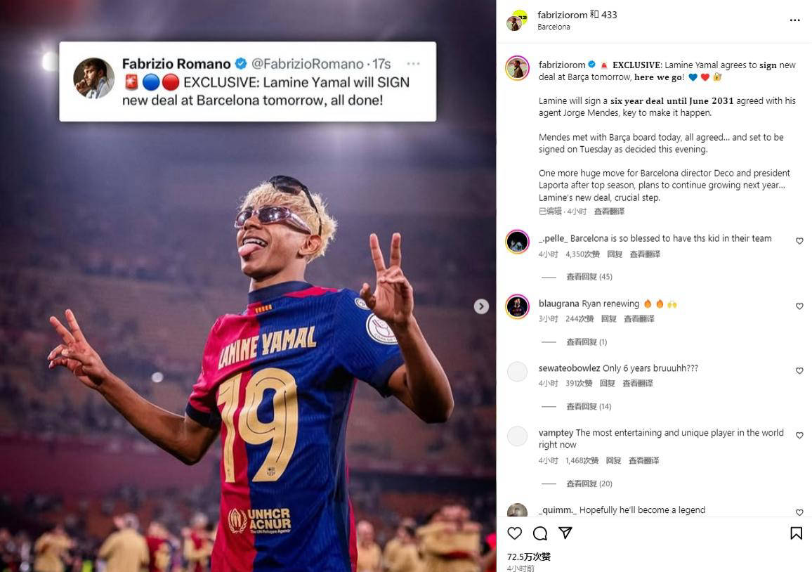 经知名转会专家罗马诺的报道,巴萨即将与亚马尔完成续约至2031年的协议。这标志着亚马尔将成为巴萨未来重要的一环,巴萨管理层决定续约他们相信是俱乐部未来发展的关键一步。