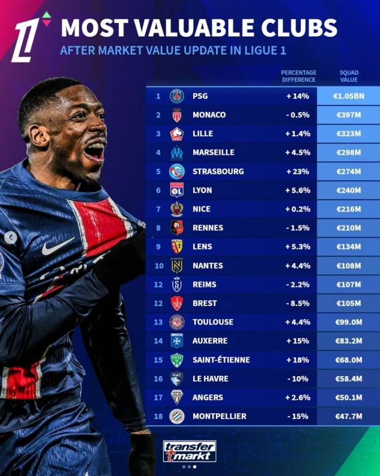 法甲球队身价排行(括号内为更新后变化幅度):